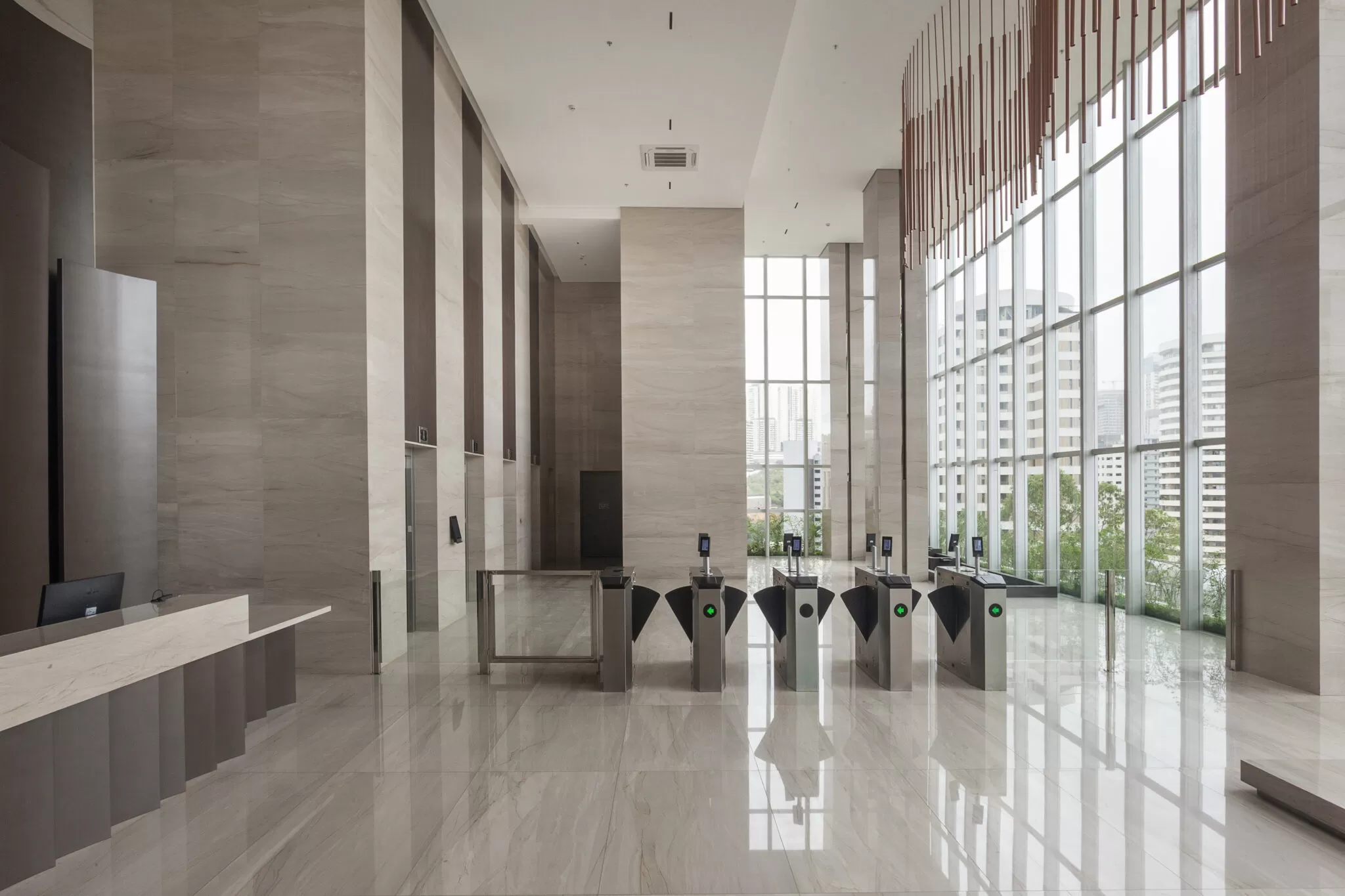 Arquitetura moderna, hall de entrada com acabamentos sofisticados e pé direito triplo