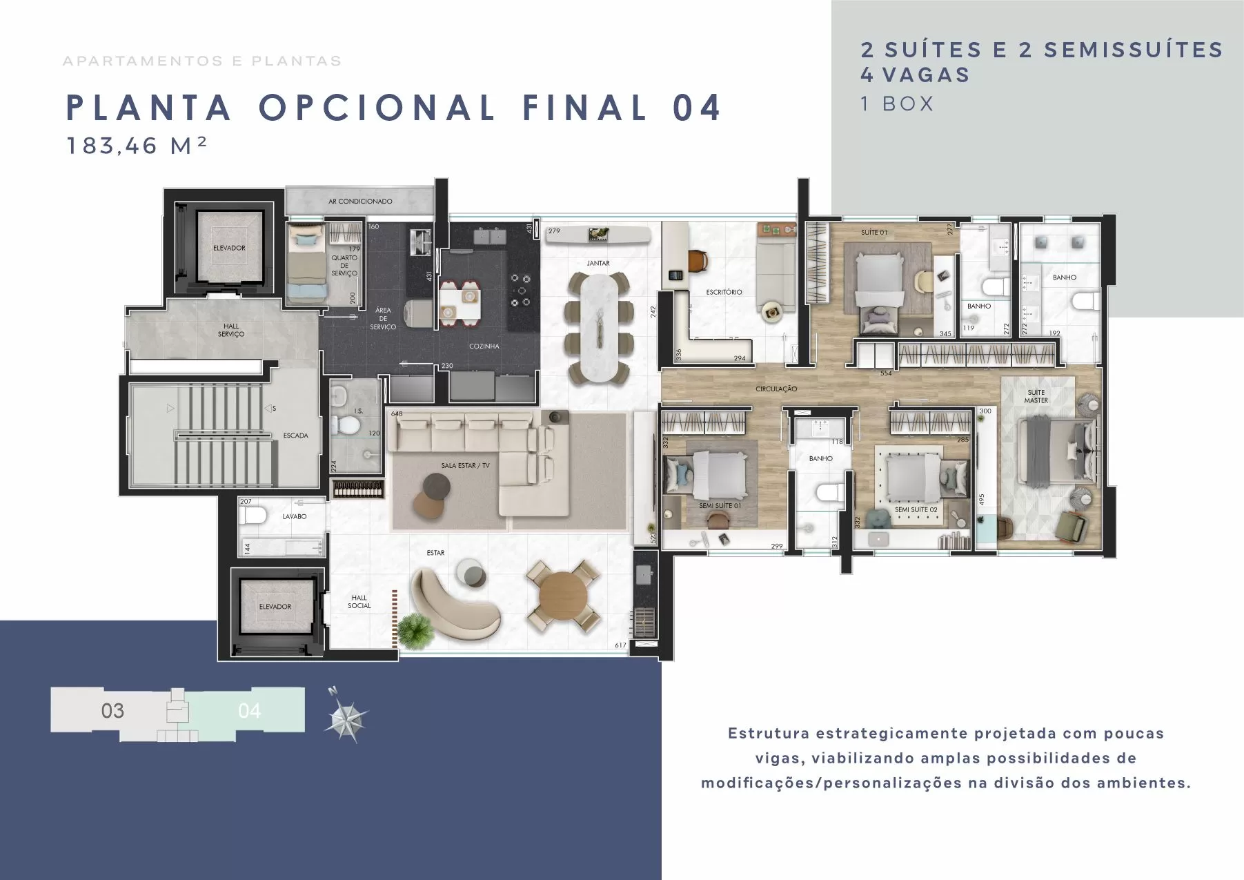 4 quartos sendo 4 suítes ou 2 suítes e 2 semissuítes